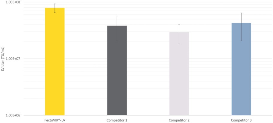 FectoVIR®-LV increases up to 3-fold functional titers in comparison to other commercially available lentivirus-specific transfection reagents (Fig.1)