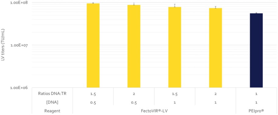 Fig 2. FectoVIR®-LV transfection protocol uses less DNA quantity and optimizes titers to improve process economics. Lentiviral vectors were produced using FectoVIR®-LV or PEIpro® and a 4-plasmid system in 125 mL flask with HEK-293T cell cultivated in suspension. The transfection mix was incubated during 30 min, using different ratio DNA:transfection reagent (from 1.5 to 2), DNA quantity (from 0.5 to 1 µg/10E6 cells) using FectoVIR®-LV and using recommended transfection protocol with PEIpro®. LV were harvested 72h post-transfection. Functional titers were measured using an infectivity test.