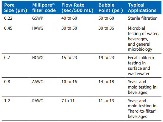 This study takes a broad look at the influence of different pore sizes on some common microorganisms. It provides data on the effect of pore size on growth and recovery. The study compares a variety of microorganism/media combinations on a range of pore sizes: 0.22, 0.45, 0.7, 0.8, and 1.2 µm. The filtration method used in the study was a standard glass funnel and base with vacuum. Test filters were plated on solid (agar) media and compared against spread plates.