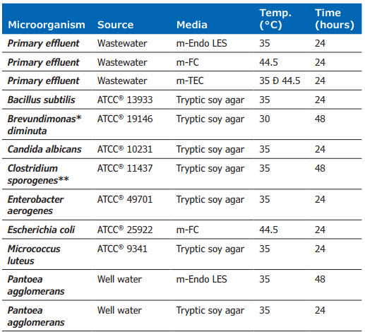 The microorganisms and media combinations used in this study were chosen as a broad representation of common membrane filter applications: pharmaceutical, food and beverage, USP testing, water testing, and general microbiology (Table 2).