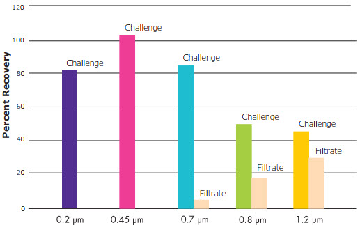 - The larger pore sizes (1.2 and 0.8 µm) allowed significant passage of a small organism at low challenge levels (starved B. diminuta) but there was no passage with the 0.45 or 0.22 µm pore sizes.