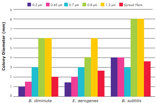 - Other test methods showed virtually no difference in colony size with any of the other pore sizes as compared to colonies grown on spread plates.