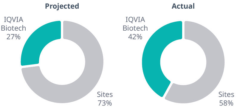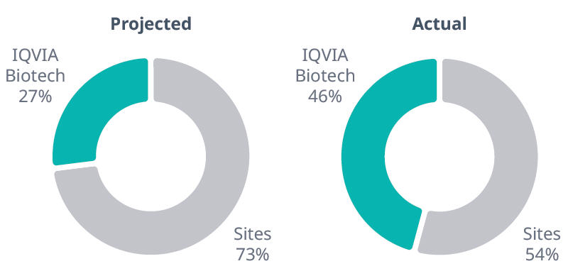 IQVIA Biotech’s efficient management helped ensure the most effective use of the advertising budget, including daily monitoring of the sites’ advertising responses and screening results. Full randomization was completed within the sponsor’s timelines with overall sites’ enrollment exceeding the projected level of 27% for recruitment management participating sites. IQVIA Biotech’s combined four-study average recruitment contribution was 35%, with a high of 44%, and three out of four studies surpassing the projected 27% enrollment goal. In a country-by-country evaluation, IQVIA Biotech surpassed the projections in ten out of 13 countries.