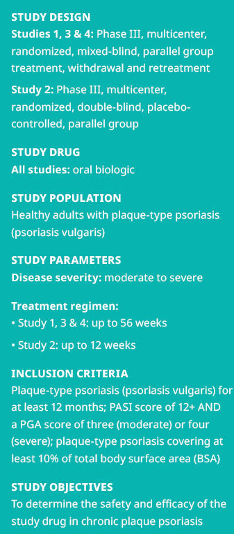 A leading global pharmaceutical company selected IQVIA™ Biotech to support four large, international Phase III biologic studies in moderate to severe psoriasis. IQVIA Biotech’s dermatology team was selected because of its proven patient recruitment process with a record of enrollment that could save the sponsor time and money.