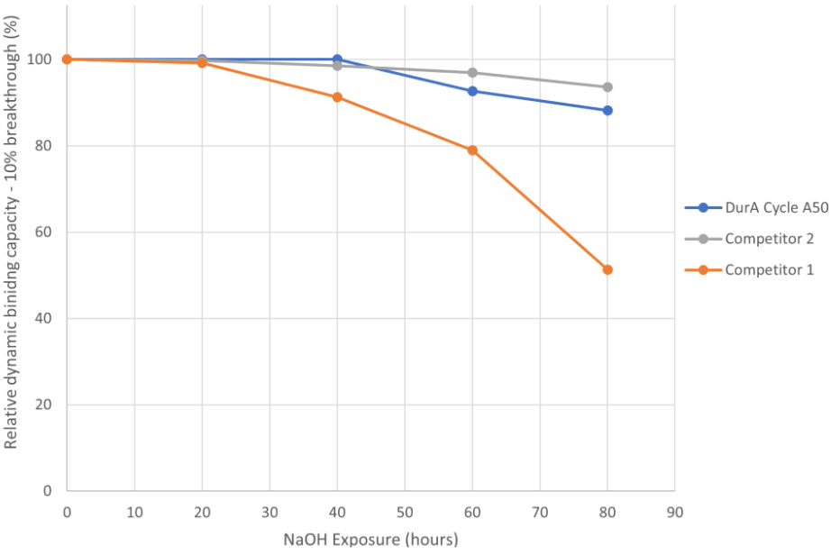 DurA Cycle A50 is alkaline stable for over 60 hours of exposure to 0.5 M NaOH, and over 300 hours of exposure to 0.1 M NaOH.