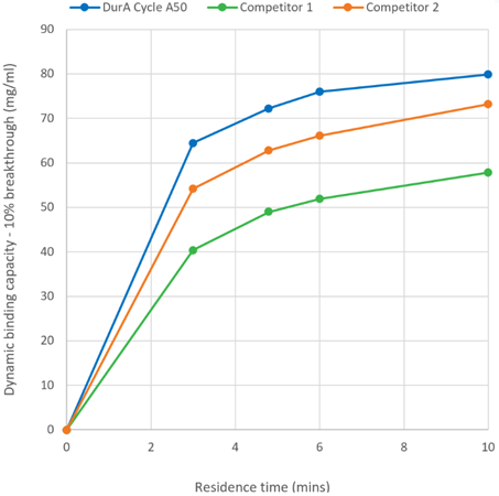 DurA Cycle A50 exhibits high dynamic binding capacities for conventional monoclonal antibodies, up to 80 g/l at a 10-minute residence time. Patented Jetting technology, coupled with the latest Protein A ligand technology, allows for high capacity even at low residence times. The resin is uniquely suited to address the demands of modern bioprocessing, from high-titer cell cultures to continuous chromatography formats.