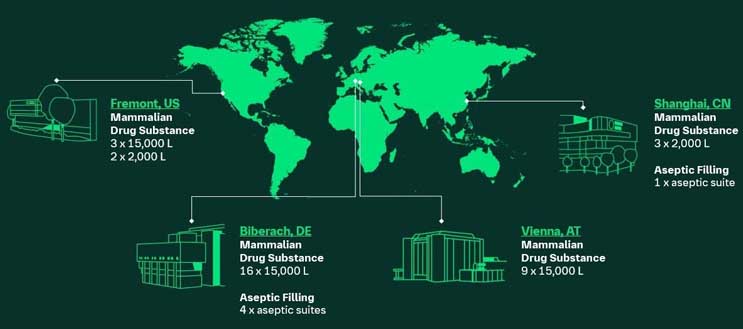 With roughly 430,000 L of commercial mammalian drug substance capacity distributed between the USA (Fremont California), Germany (Biberach), Austria (Vienna) and China (Shanghai) our global network for mammalian cell culture manufacturing is waiting for you. These cGMP facilities are licensed by the EMA, FDA & MHLW and show our unwavering commitment to reliable high-quality clinical and commercial supply.