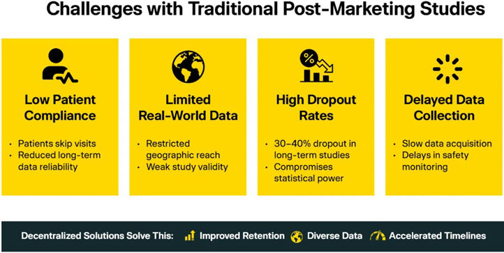 Traditional fixed-location sites face persistent challenges in post-marketing surveillance and post-approval studies. Limited patient access slows real-world data capture, while travel burden and scheduling constraints reduce retention and compromise patient safety monitoring. High operational costs and limited flexibility also make it difficult to generate evidence-based insights across diverse populations, which regulatory bodies such as the U.S. Food and Drug Administration (FDA) increasingly expect for ongoing safety studies.